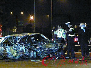 事發(fā)凌晨零時10分,相撞的兩輛私家車的其中一輛內(nèi)有3人,車右側(cè)被撞得粉碎,碎片散落一地,右邊的前輪完全凹進(jìn)去,前車玻璃也被撞破。所幸司機(jī)只受了輕傷,隨后被120接走。而另一輛車則被撞得嚴(yán)重變形,起火燃燒,只剩下鐵架。從外面看,已經(jīng)看不到里面有人。但清障車的工作人則說“里面的那個人燒成炭了”。凌晨1時30分左右,殯儀館車來到現(xiàn)場。由于車嚴(yán)重變形,車門打不開,運(yùn)政人員只好用鐵鍬把門撬開。(練情情)