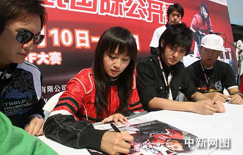 11月11日AGF亞洲方程式國(guó)際公開賽珠海站決戰(zhàn)前,AGF第一巾幗車手曹穎與方程式車手在珠海國(guó)際賽車場(chǎng)簽贈(zèng)海報(bào)。數(shù)千名車迷、穎迷把現(xiàn)場(chǎng)圍得水泄不通,險(xiǎn)些擠垮舞臺(tái)。主辦方只好將原定40分鐘的簽名儀式縮短到半小時(shí)。
