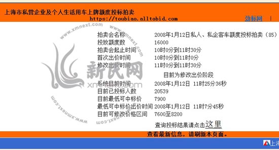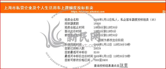 11時(shí)30分,本市2008年第一次私人、私營(yíng)企業(yè)客車額度競(jìng)標(biāo)結(jié)束,新民網(wǎng)薛驍翔從現(xiàn)場(chǎng)發(fā)回最新消息稱,本次私車額度平均中標(biāo)價(jià)為23370元,比上月減少32672元,下跌近60%;最低中標(biāo)價(jià)為8100元,比上月足足跌了41900元,投標(biāo)人共計(jì)20539人。