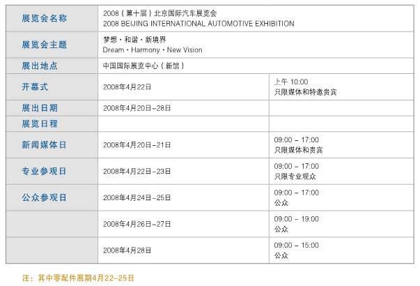 展覽時(shí)間:國內(nèi)外整車、商用車的展覽時(shí)間是 2008年4月22日至4月28日;國內(nèi)外零部件的展覽時(shí)間為2008年4月22日至4月25日。