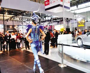 、賄OLVO在這次車展上,開了兩個非常特別的展區(qū)。一個展示上衣和褲子;一個用電子系統(tǒng)教你畫畫,看來廠家為了銷售自己的理念越來越“不務正業(yè)”了。