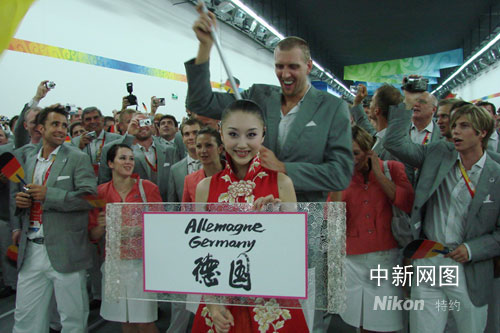 8月8日晚上,唐雯帶領(lǐng)著465名德國隊員走入了鳥巢,她舉著牌子,后面緊跟的是德國隊的旗手、NBA著名球星諾維斯基……