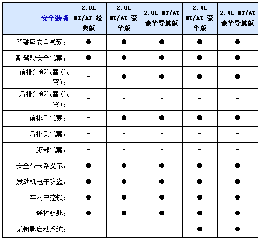 內(nèi)飾方面2.0L均配備織物座椅,而2.4L車型則采用真皮坐椅并且配備電加熱座椅,并且2.0L配備6向手動調(diào)節(jié)駕駛座椅,而2.4L配備8向電動調(diào)節(jié)并且代腰部支撐的駕駛座椅,不過副駕駛?cè)囅抵粯伺?向手動調(diào)節(jié)座椅,另外入門級車型只配備CD播放器,2.0L和2.4L豪華型采用6CD播放器,而2.0L和2.4L豪華導(dǎo)航型配備DVD播放器和6.5寸寬屏液晶顯示器;包括導(dǎo)航功能,全系標配6喇叭揚聲器、多功能方向盤自動分區(qū)空調(diào)和后排足部出風(fēng)口。