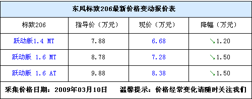 就在東風(fēng)標(biāo)致推出207車(chē)型的同時(shí),標(biāo)致206車(chē)型也隨之停產(chǎn)。近日,我們從北京地區(qū)的部分東風(fēng)標(biāo)致4S店處獲悉,現(xiàn)在標(biāo)致206正在清理庫(kù)存,優(yōu)惠較大,目前206僅有3款車(chē)型有現(xiàn)車(chē),分別是躍動(dòng)版1.4手動(dòng),躍動(dòng)版1.6手動(dòng)和自動(dòng),現(xiàn)車(chē)最高優(yōu)惠1.5萬(wàn)元元,售價(jià)分別為6.68萬(wàn),7.28萬(wàn)和8.38萬(wàn)元,現(xiàn)車(chē)比較充足,感興趣的朋友可以到店看車(chē),價(jià)格還能有所降低。詳情請(qǐng)見(jiàn)下表。
