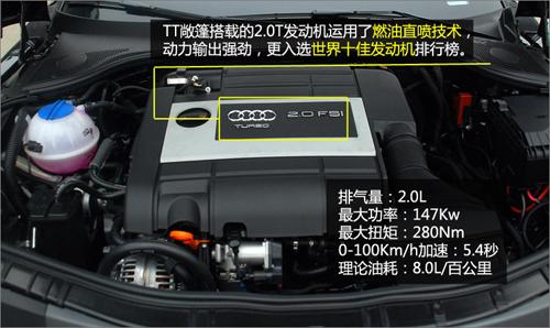 我們實拍的這臺奧迪TT敞篷采用渦輪增壓器和FSI燃油直噴技術(shù)的2升4缸發(fā)動機。它可輸出147千瓦的功率,產(chǎn)生280牛米的扭矩,并保持轉(zhuǎn)速范圍在1800-5000轉(zhuǎn)/分鐘之間。值得一提的是,這款高效而節(jié)能的發(fā)動機入選2009年Wards Auto的“世界十佳發(fā)動機”排行榜,實力毋庸置疑。