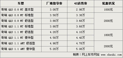 據(jù)4S店銷售人員介紹,目前QQ3的優(yōu)惠幅度在1000元-2000元之間,優(yōu)惠形式各4S店有一定的差別,主要以現(xiàn)金優(yōu)惠和贈(zèng)送裝飾為主。目前最QQ3最便宜車型價(jià)格已經(jīng)不足3萬元,最為一款都市時(shí)尚代步工具而言,這樣的價(jià)格非常的實(shí)惠,F(xiàn)車方面,QQ3有多種顏色可選,消費(fèi)者可到店看車選購(gòu)。
