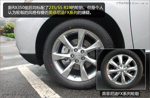 為了突顯自己的運(yùn)動(dòng)特性,新RX3550標(biāo)配了更大的235/55 R19輪胎,抓地性能要較舊款有著一定的提高。但是個(gè)人認(rèn)為鋁合金的輪轂有模仿英菲尼迪FX系列輪轂的嫌疑。
