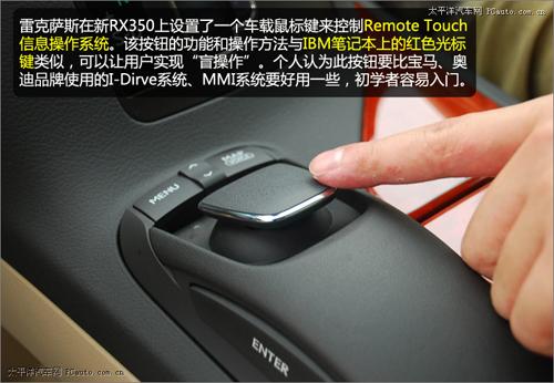 雷克薩斯在新RX350上設(shè)置了一個(gè)車(chē)載鼠標(biāo)鍵來(lái)控制最新的Remote Touch信息操作系統(tǒng)。該按鈕的功能和操作方法與IBM筆記本上的紅色光標(biāo)鍵類(lèi)似,可以讓用戶(hù)實(shí)現(xiàn)“盲操作”。只需輕輕擺動(dòng)該按鈕,車(chē)載電腦屏幕上的鼠標(biāo)鍵便會(huì)按照指示移動(dòng)。個(gè)人認(rèn)為此按鈕要比寶馬、奧迪品牌使用的I-Dirve系統(tǒng)、MMI系統(tǒng)好用一些,初學(xué)者也容易入門(mén)。據(jù)悉,這套控制系統(tǒng)將逐步推廣到雷克薩斯全系車(chē)型上。