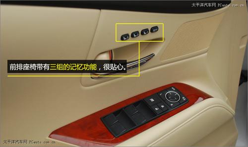 將目光轉(zhuǎn)移到中央扶手側(cè),我們發(fā)現(xiàn)雷克薩斯的前排座椅帶有三組記憶功能,很貼心。電動(dòng)后視鏡調(diào)節(jié)按鈕、車(chē)窗升降按鈕亦集中在駕駛員一側(cè)的門(mén)把手上。