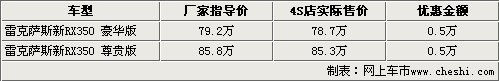 據(jù)北京雷克薩斯4S店銷售人員介紹,目前各4S店均有新RX350的現(xiàn)車銷售,而且貨源相對比較充足,F(xiàn)在購車在可以得到5000元的現(xiàn)金優(yōu)惠還,還可以得到商家贈送的簡單裝飾。銷售人員還表示,新款RX350由于原裝進(jìn)口車型,所以車型的手續(xù)還有到店。消費者在購車后還需要等待10個工作日左右才可以上牌。