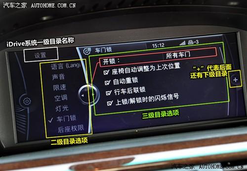當(dāng)我們進(jìn)入“設(shè)置”選項(xiàng)的二級(jí)目錄時(shí),在二級(jí)目錄的左右兩邊我們可以看到兩種不同的圖標(biāo)。左邊的圓形帶有兩個(gè)小箭頭的圖標(biāo)表示如果想進(jìn)入左側(cè)的上級(jí)目錄需要使用②撥動(dòng)方式向左撥動(dòng)旋鈕進(jìn)入,而右邊的特殊圖標(biāo)表示如果想進(jìn)入右側(cè)的下級(jí)目錄需要使用③向下按的方式進(jìn)入。總的來(lái)說(shuō),這種左右分列的目錄形式比老款要更符合人們的日常習(xí)慣,因此比老款iDrive系統(tǒng)更容易得到用戶的認(rèn)可。