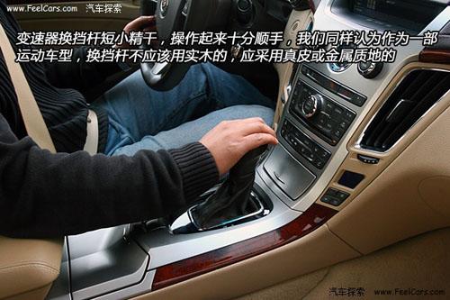 接著轉(zhuǎn)向車內(nèi)看看,真皮方向盤手感極佳,唯一不足的是尺寸有點大,而且上半部的實木包裹也與CTS的運(yùn)動風(fēng)格不太相符。變速器換擋桿短小精干,操作起來十分順手,不過我們同樣認(rèn)為作為一部運(yùn)動車型,換擋桿不應(yīng)該用實木的,而應(yīng)該用皮質(zhì)或金屬的。