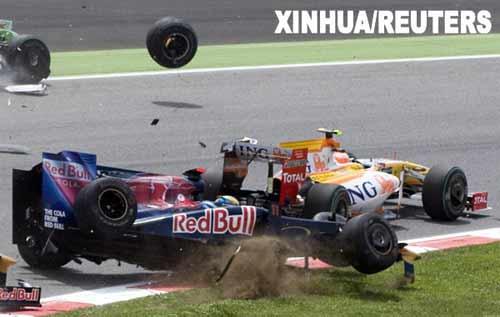 5月10日,紅牛二隊車手布爾代(左)駕駛的賽車在碰撞之后騰空。當日,F(xiàn)1西班牙大獎賽落幕,布朗GP車隊的英國車手巴頓奪得冠軍。新華社/路透