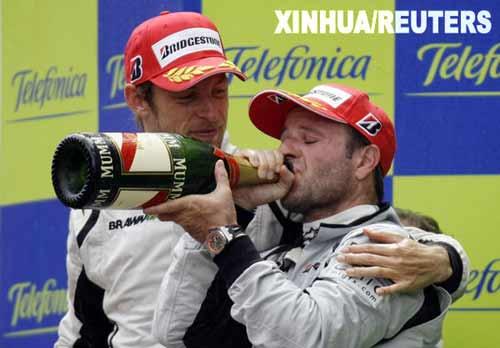 5月10日,布朗GP車隊的英國車手巴頓(左)和隊友巴里切羅慶祝勝利。當(dāng)日,在F1西班牙大獎賽中,巴頓奪得冠軍,巴里切羅獲得亞軍。新華社/路透