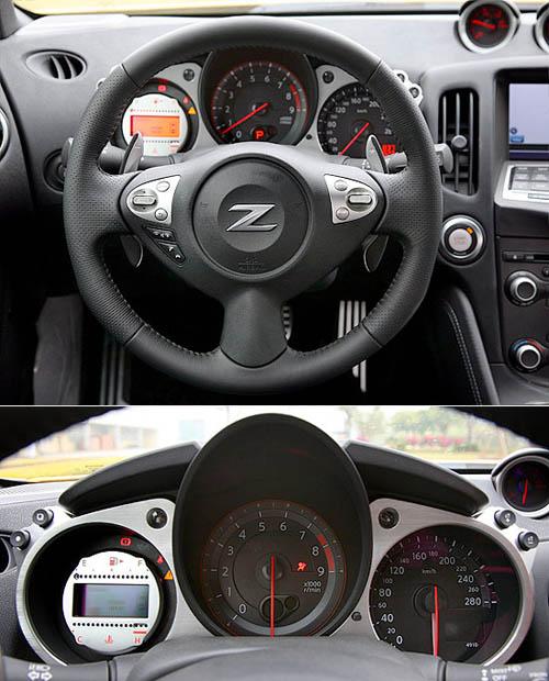 不過370Z與350Z車室仍有相當(dāng)程度的差別。首先就方向盤,370Z已換上日產(chǎn)新一代的三幅式方向盤,與英菲尼迪新一代FX的三幅式方向盤相同,方向盤上整合了音響系統(tǒng)、定速巡航系統(tǒng)和藍(lán)牙通訊等多功能按鍵;而其后兩片鎂合金制作的方向盤換檔撥片,同樣讓人愛不釋手。