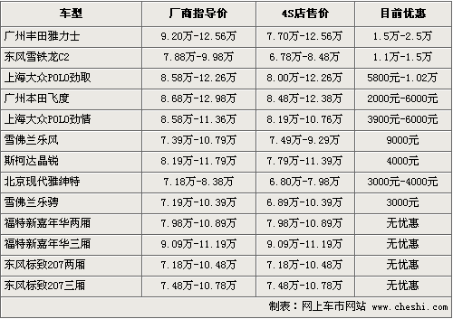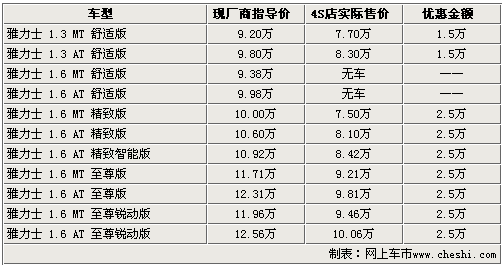 據(jù)4S店銷售人員介紹,目前廣州豐田各4S店內(nèi)雅力士1.3L現(xiàn)車較少,而1.6排量的車型就相對比較充足,并可提供試乘試駕服務,消費者可在展廳內(nèi)近距離接觸展車、親身體驗試駕車后直接購買現(xiàn)車。銷售人員表示,現(xiàn)在到店購買雅力士的消費者可享受到最高達2.5萬的價格優(yōu)惠,還可得到商家贈送的簡單裝飾等。