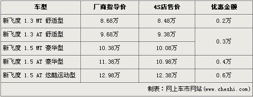 據(jù)廣州本田北京地區(qū)4S店銷售人員介紹,新飛度 1.5L炫酷運動版的優(yōu)惠金額為6000元。新飛度在售車型分為1.3L及1.5L共5個車型在售,1.3L手動舒適版的優(yōu)惠金額為2000元,現(xiàn)售價為8.48萬元。1.3L自動舒適版的優(yōu)惠金額為3000元,現(xiàn)售價為9.38萬元。1.5L豪華版的手動和自動車型經(jīng)4000元優(yōu)惠后,現(xiàn)售價分別為10.08萬元和10.98萬元,1.5L炫酷運動版的優(yōu)惠6000元,現(xiàn)售價為12.38萬元。