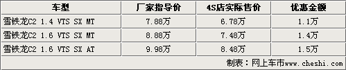 目前北京地區(qū)4S店主要賣的是C2運動版VTS車型,購車的消費者不僅可以享受到最高1.5萬元的現(xiàn)金優(yōu)惠,而且還能得到商家隨車贈送的部分車內(nèi)裝飾。目前C2運動版VTS主要有紅色、黑色等款,顏色和車型并不是很全,個別款需要預訂,其余車型均沒有現(xiàn)車銷售。