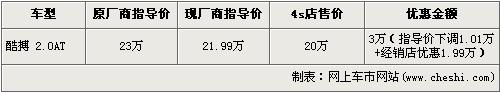 根據(jù)4s店銷售人員介紹,目前官方對酷博 2.0 AT版車型的廠商指導價下調(diào)了1.01萬元,下調(diào)后廠商指導價從23萬元降到了21.99萬元,并且在店內(nèi)購車的消費者還可以得到經(jīng)銷店送出的1.99萬元的優(yōu)惠。經(jīng)總優(yōu)惠后,道奇酷博的售價降到了20萬,F(xiàn)車方面,店內(nèi)酷搏現(xiàn)車不多,錯過的消費者只能交1萬元訂金,下個月才可提車。