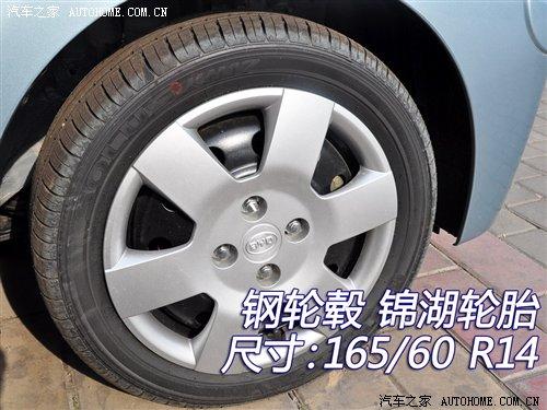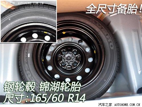 比亞迪F0的四款車型都裝備了尺寸為165/60 R14的錦湖輪胎,其中高配的尊貴型和旗艦型采用的是鋁合金輪轂。我們實拍的這款車配備的是鋼輪轂,顯然是低配車型。四款車的備胎都是尺寸165/60 R14的錦湖輪胎,鋼輪轂。因此在這輛低配車上是全尺寸備胎。