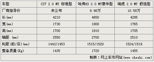 在基本參數(shù)方面,獵豹CS7要比源自轎車平臺的瑞虎還要小一些,車長只有4210mm,但軸距要比瑞虎大一些,當(dāng)然三款車中哈弗H3明顯要大一號,無論車長還是軸距方面。也就意味著從外觀上看,哈弗H3將很大氣,而獵豹CS7要小巧一些。