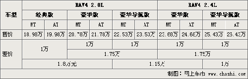 實(shí)現(xiàn)國(guó)產(chǎn)化后的RAV4分有2.0L與2.4L兩種排量并分別提供手動(dòng)擋與自動(dòng)擋車型,同時(shí)也因變速箱的差異,在RAV4全系的AT與MT車型間也就有了1萬(wàn)元的差異。同樣,由于配置的不同,經(jīng)典版RAV4與豪華版間的差價(jià)為1.8萬(wàn)元,豪華版與頂配豪華導(dǎo)航版車型也存在著1.75萬(wàn)元的差價(jià)。而因搭載了不同排量的發(fā)動(dòng)機(jī),RAV4 2.0L豪華導(dǎo)航版和2.4的豪華版車型的差價(jià)為1.15萬(wàn)元。