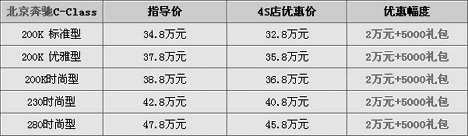 市場情況:奧迪A4L的上市大大分流了奔馳C級的目標(biāo)客戶群,所以C-Class也終于抵不住了,在上市大半年后推出了現(xiàn)金優(yōu)惠方案。據(jù)悉,C-Class全系均可優(yōu)惠2萬元現(xiàn)金,另外再送價值5000元的禮包組合。而且現(xiàn)車充足。