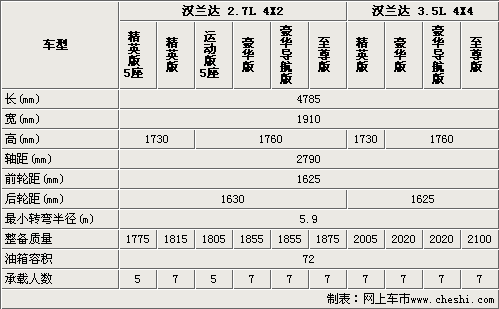 國產(chǎn)漢蘭達(dá)的車身尺寸與進(jìn)口車型相同,由于國產(chǎn)漢蘭達(dá)精英型沒有配備車頂行李架,所以要比運(yùn)動版、豪華版和至尊版矮了30mm。將近2.8米的軸距為漢蘭達(dá)提供了舒適的內(nèi)部空間。國產(chǎn)漢蘭達(dá)較進(jìn)口車型有添加了5座車型,進(jìn)一步滿足了不同消費(fèi)者的需求(進(jìn)口車型均為7座車型)。國產(chǎn)漢蘭達(dá)的轉(zhuǎn)彎半徑僅為5.9米,保證了該車型的道路通過性。