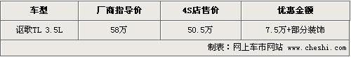 據(jù)4S店銷售人員介紹,目前謳歌TL現(xiàn)車最高可優(yōu)惠到50.5萬元,而原來廠商指導(dǎo)價格為58萬元,直降幅度達到了7.5萬元,同時部分店內(nèi)還將贈送一部分車內(nèi)裝飾。目前現(xiàn)車供應(yīng)比較充足,主要有黑色、銀色、灰色、紅色等。欲購車的消費者可以到店試乘試駕這款車。