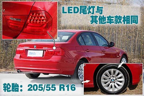 車尾部分318的尾燈與其他款式車型相同,使用了夜晚辨識性更高、反映更快的LED燈泡。該車配備了205/55 R16的馬牌防爆輪胎,如果輪胎虧氣仍然可以行駛150公里。