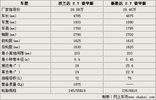國產(chǎn)漢蘭達(dá)和現(xiàn)代新勝達(dá)均屬于一個(gè)級別的城市SUV車型,兩款車型均是2.7排量的高配車型,售價(jià)相差了4200元。在車身尺寸方面,國產(chǎn)漢蘭達(dá)在車長、車寬、均超過了現(xiàn)代新勝達(dá),這一點(diǎn)保證了其內(nèi)部橫向空間及頭部空間的寬敞。在軸距方面,豐田漢蘭達(dá)比新勝達(dá)長出了90mm,這一點(diǎn)意味著漢蘭達(dá)的腿部空間將會優(yōu)越于新勝達(dá)。兩款車型的離地空間都達(dá)到了203mm,確保了它們在復(fù)雜路面上的道路通過性。越野性能方面,國產(chǎn)漢蘭達(dá)要優(yōu)越于新勝達(dá),這點(diǎn)從接近角和離去角的數(shù)據(jù)就可以看出來。豐田漢蘭達(dá)的前后輪距和輪胎橫截面數(shù)據(jù)都要大于新勝達(dá),這表明在操控性能上漢蘭達(dá)將會略勝一籌。漢蘭達(dá)和新勝達(dá)的油箱均達(dá)到了75升上下,可以為其提供良好的續(xù)航能力。