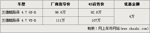 據(jù)經(jīng)銷商銷售人員介紹,豐田-蘭德酷路澤分為4.0L和4.7L兩種排量,由于4.0L車型的尾氣排放是歐III標(biāo)準(zhǔn),沒有達(dá)到北京施行的歐IV標(biāo)準(zhǔn),所以北京限賣,店內(nèi)沒有4.0L車型。4.7L車型分為GX-R版和VX-R版,目前購買蘭德酷路澤的消費(fèi)者可以得到4萬元的優(yōu)惠。經(jīng)優(yōu)惠后,GX-R版售價降為了92.6萬元,VX-R版售價降到了107萬元。銷售人員還介紹,店內(nèi)沒有蘭德酷路澤現(xiàn)車,預(yù)購買者需交訂金1萬元,約等一個半月可提車。