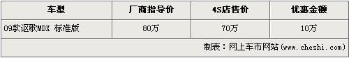 據(jù)經(jīng)銷商銷售人員介紹,09款謳歌-MDX的現(xiàn)金優(yōu)惠10萬元,優(yōu)惠后售價也從原廠商售價80萬降到了70萬。銷售人員還介紹,09款謳歌MDX增加的實用性的配件包括前下護板和后下護板,能避免惡劣路況對底盤帶來的損傷,并且09款謳歌MDX還新增了巴厘海藍和摩卡褐金兩種顏色,店內現(xiàn)車非常充足,顏色也比較全,欲購買者挑選的空間非常大。