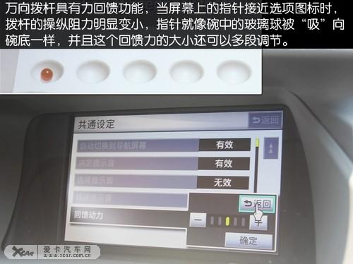 而且萬向撥桿居然有力回饋功能,當(dāng)屏幕上的指針接近選項(xiàng)圖標(biāo)時,撥桿的操縱阻力明顯變小,指針就像碗中的玻璃球被“吸”向碗底一樣,并且這個回饋力的大小還可以多段調(diào)節(jié)。