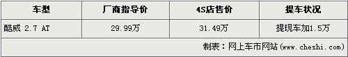 據(jù)4S店銷售人員介紹,在售的道奇酷威為2.7L自動檔車型,售價為29.9萬元。近期購買酷威的消費者如要在經(jīng)銷店提現(xiàn)車,需在廠商指導價29.99萬元的基礎(chǔ)上加價1.5萬元才可提車,加價后的價格增長為31.49萬元。銷售人員還介紹,店內(nèi)只有一輛酷威銀色現(xiàn)車。