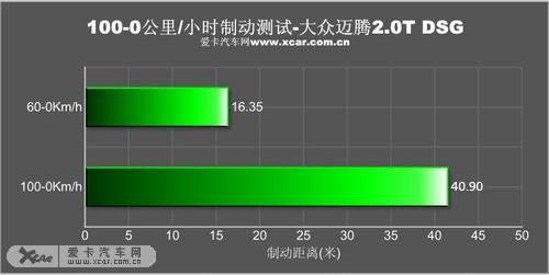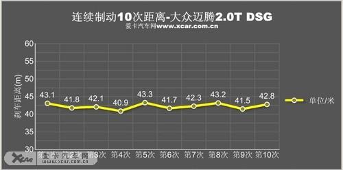 接下來(lái)的十次連續(xù)剎車測(cè)試中,新邁騰的剎車系統(tǒng)又表現(xiàn)出它穩(wěn)定的一面。高強(qiáng)度的連續(xù)測(cè)試,剎車系統(tǒng)依然可靠,并沒有出現(xiàn)明顯的熱衰退現(xiàn)象,最后兩次剎車也將成績(jī)保持在43米之內(nèi)。出現(xiàn)在第四次測(cè)試的最好剎車成績(jī)也鎖定在40.90米,良好的剎車品質(zhì)更讓人信賴,相信在換上更寬的輪胎后,成績(jī)肯定會(huì)再次提高。