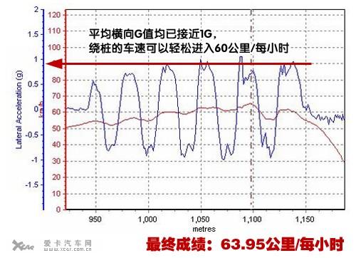 從曲線圖中我們可以看出,邁騰的平均橫向G值均已接近1G,繞樁的車速可以輕松進(jìn)入60公里/每小時(shí),而最終63.95公里/每小時(shí)的18米繞樁成績(jī),再次展現(xiàn)出大眾PQ46平臺(tái)的強(qiáng)大實(shí)力。
