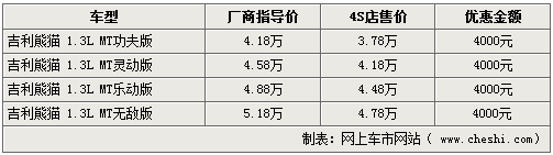 據(jù)銷售人員介紹,吉利熊貓的各款車型現(xiàn)在已經(jīng)可滿足消費(fèi)者需要。目前主推4.58萬的靈動(dòng)版和4.88萬的樂動(dòng)版,兩款車型是銷量最佳的車型,并有試駕車提供給客戶體驗(yàn)。另外,銷售人員表示,目前購買吉利熊貓系列車型4S最多可以優(yōu)惠4000元現(xiàn)金。