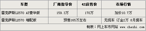 筆者目前從雷克薩斯經(jīng)銷商處了解,雷克薩斯LX570因產(chǎn)能有限,貨源供應非常緊張。目前基本是訂單式銷售,而提現(xiàn)車的話加價金額則超過了10萬元。同時,雷克薩斯LX570增配版車型將于8月份到店,銷售人員介紹,增配版車型將增加智能副駕系統(tǒng),同時在內(nèi)飾和外觀上也有小幅的變化,預計售價在165萬左右。具體售價目前尚未公布,現(xiàn)在消費者訂車需要2萬元定金,一個月左右方可提車。