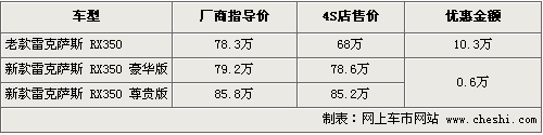 筆者從雷克薩斯經(jīng)銷商處了解,目前雷克薩斯有數(shù)量不多的老款車型甩賣,目前最低僅售68萬元,只有銀色款有現(xiàn)車供應(yīng),優(yōu)惠幅度也達到了10.3萬元。同時銷售的新款車型售價分別為79.2萬和85.8萬元,目前優(yōu)惠幅度非常小,僅有0.6萬元。新款車型也有少量現(xiàn)車供應(yīng),具體詳情消費者可以到店咨詢。