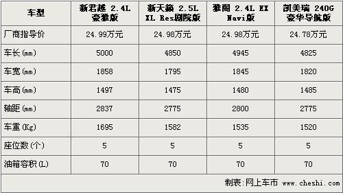 提到中級車市場,人們便會很快的想到新雅閣、新凱美瑞和新天籟這三款日系車型,它們在中級車市場里算是鼎鼎有名的“三位”了。隨著今年7月8日別克繼新君威后的又一力作新一代君越的正式上市,中級車市場迎來了又一款“重量級”車型。新君越的上市更加鞏固了別克在中級車市場的位置,并且給同級別的中級車帶來了更強的競爭力。既然有新車型加入了隊列,那么同級車之間價格和配置的“競爭戰(zhàn)”是必不可少的。下面我們就為您挑選了新君越2.4L豪雅型、新天籟2.5L XL RES劇院版、雅閣2.4L EX導(dǎo)航版和凱美瑞240G 豪華導(dǎo)航版四款價格相近的中級車作為比較,看看這四款熱門車?yán)铮目钴囆透m合將要購入中級車的您。