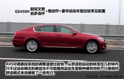 GS450h上裝配的AVS適應(yīng)式可調(diào)懸掛系統(tǒng),可以自動(dòng)連續(xù)調(diào)整減震器的阻尼。當(dāng)然,也可以通過人工設(shè)置,分為普通和運(yùn)動(dòng)兩種狀態(tài)。普通模式下,懸掛和減震系統(tǒng)更多的顧及車內(nèi)舒適程度,偏軟的懸掛和松軟舒適的座椅讓駕駛員很難有想深踩油門的沖動(dòng),大部分的路感被懸掛系統(tǒng)吸收,傳進(jìn)車內(nèi)的只有少數(shù)幅度稍大一點(diǎn)的波動(dòng);運(yùn)動(dòng)模式下的懸掛系統(tǒng)表現(xiàn)得相對(duì)更敏感,對(duì)路面信息的傳遞也更清晰一些,但還談不上純正的運(yùn)動(dòng)車型的那種硬邦邦的懸掛調(diào)校,畢竟這不是那一類型的車。