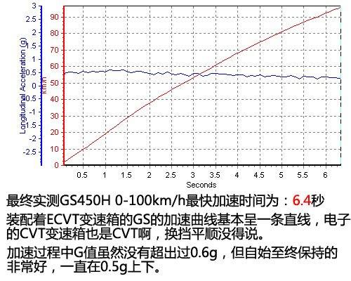 起步階段感覺GS450h還比較平和,雖然起步時車身姿態(tài)控制的比較好,但感覺有點(diǎn)無力。從工況圖上看,GS450h的加速能力不算很強(qiáng)但非常均衡,最大的G值不超過0.6g,但從始至終也沒有低于過0.5g。加速過程中裝配著ECVT變速箱的GS450h的曲線基本呈一條直線,CVT變速箱換擋的平順性在這里發(fā)揮的淋漓盡致。