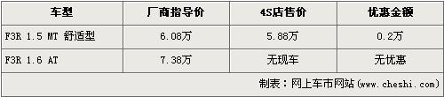 據(jù)比亞迪汽車北京地區(qū)4S店銷售人員介紹,目前北京在售的比亞迪F3R有兩款車型。1.5L手動舒適版經(jīng)2000元的優(yōu)惠后售價從6.08萬降到了5.88萬元,1.6L自動檔車型目前店內(nèi)沒有現(xiàn)車,所以不在此次優(yōu)惠隊(duì)列中。