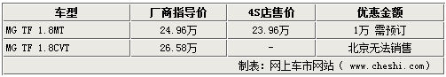 與比亞迪S8同為敞篷跑車設(shè)計的MG TF跑車在北京市場仍為訂單銷售狀態(tài)。網(wǎng)上車市網(wǎng)站由北京名爵經(jīng)銷商處了解到,現(xiàn)在購買名爵MG TF跑車,雖然在價格上有萬元的優(yōu)惠,但是各店均無現(xiàn)車,需要提前預(yù)訂,具體詳情如下: