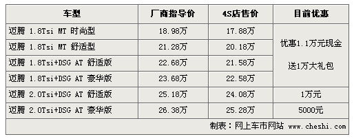 據(jù)4S店銷售人員介紹:目前邁騰最高優(yōu)惠1.1萬元,再送1萬元裝飾套餐,其中包括9項升級,總計優(yōu)惠可達2.1萬元。目前邁騰現(xiàn)車充足,銷量最大的黑色車現(xiàn)車較多,并且邁騰全系均可享受1萬元“大禮包”活動,但2.0Tsi車型優(yōu)惠幅度較小,建議購買1.8Tsi車型。