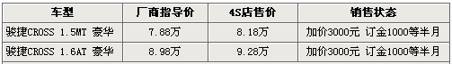 駿捷CROSS上市后,因?qū)儆诜夏贻p人時尚態(tài)度的跨界車型,駿捷CROSS在市場中的受關(guān)注度也相當(dāng)高。據(jù)華晨中華4S店銷售人員表示,駿捷CROSS上市后已有少量展車到店,主要為1.6L的自動豪華型。而現(xiàn)在購車沒有優(yōu)惠,還需要加價銷售,兩款車型均在指導(dǎo)價的基礎(chǔ)上加價3000元。同時店內(nèi)現(xiàn)車不足,仍需預(yù)訂購買,訂金1000元,半個月左右的時間即可提車。