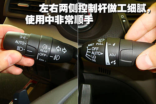 方向盤左右兩側(cè)控制桿為軟橡膠包裹手感細(xì)膩,無論是看、觸都能感覺到這部分材料的工藝質(zhì)量很好。并且旋鈕設(shè)計(jì)能夠滿足手指粗大駕駛者的使用及調(diào)節(jié)。