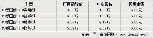 據(jù)比亞迪汽車4S店銷售人員介紹,比亞迪F0愛國(guó)版igo系列車型的現(xiàn)車并不是很齊全,實(shí)用型和舒適型都有現(xiàn)車,尊貴型和旗艦型則需要預(yù)訂,大概10-15天即可提車。而目前1.0L實(shí)用型和舒適型都有現(xiàn)車,其中實(shí)用型可以優(yōu)惠6000元,優(yōu)惠后售價(jià)已經(jīng)接近3萬;而其他車型只可以優(yōu)惠5000元現(xiàn)金。