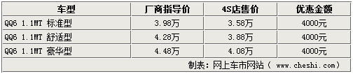 據(jù)奇瑞QQ6專(zhuān)營(yíng)店銷(xiāo)售人員介紹,奇瑞QQ6系列車(chē)型比較齊全,目前全系都有一定的優(yōu)惠幅度,除現(xiàn)車(chē)較少的車(chē)型需要提前預(yù)訂以外,全系車(chē)型均可以?xún)?yōu)惠4000元。